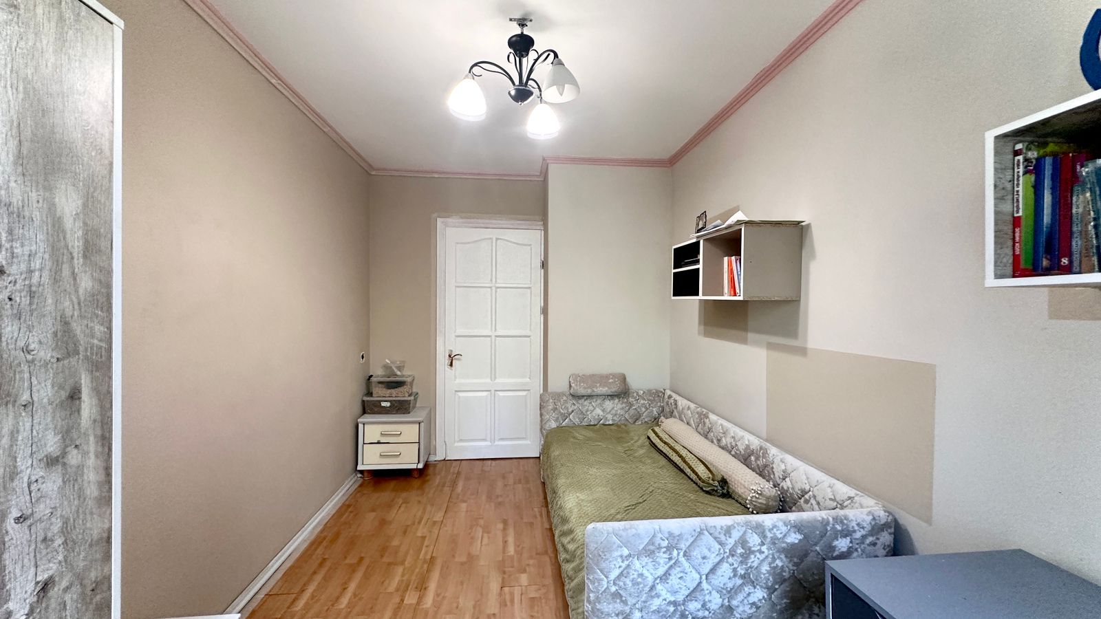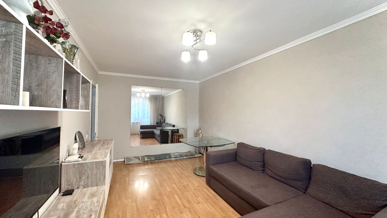 Окна выходят на две стороны — Восток/Запад. Не угловая. Планировка квартиры не нарушена, продается частично меблированная. Пол — ламинат. Стеклопакеты. Стены — левкас .